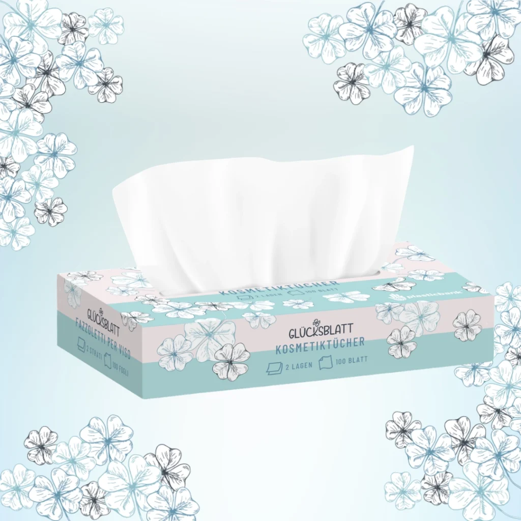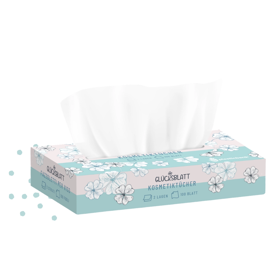 Die Glücksblatt Kosmetiktücher sind dank des verwendeten Zellstoffs besonders weich und sanft zur Haut. Dieser hochwertige Rohstoff sorgt zudem für eine hohe Reißfestigkeit und eine angenehme Haptik bei jeder Anwendung.