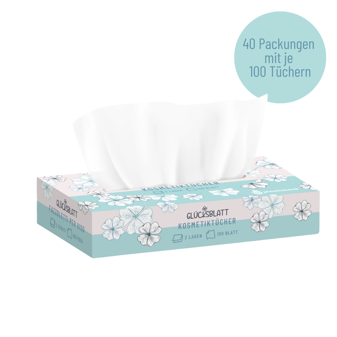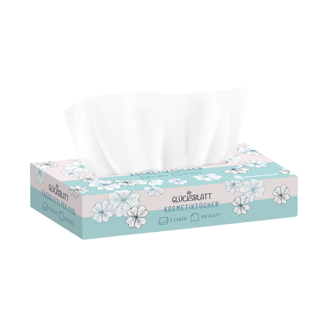 Die Glücksblatt Kosmetiktücher sind dank des verwendeten Zellstoffs besonders weich und sanft zur Haut. Dieser hochwertige Rohstoff sorgt zudem für eine hohe Reißfestigkeit und eine angenehme Haptik bei jeder Anwendung.