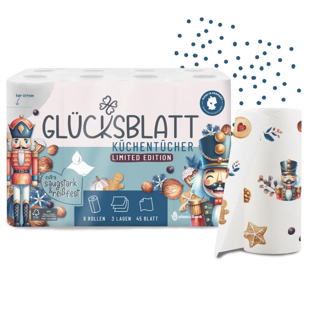 Diese sinnliche Limited Edition verzaubert durch ihre stylisches Design in sanften Farben und Motiven. Sie stimmt ein in die kalte Jahreszeit und bringt ein Plätzchen-Rezept mit sich. Geht was daneben? Kein Problem! Der Zellstoff unserer Glücksblätter stammt aus nachhaltig bewirtschafteten europäischen Wäldern und kontrollierten Quellen und ist äußerst saugstark und reißfest.
