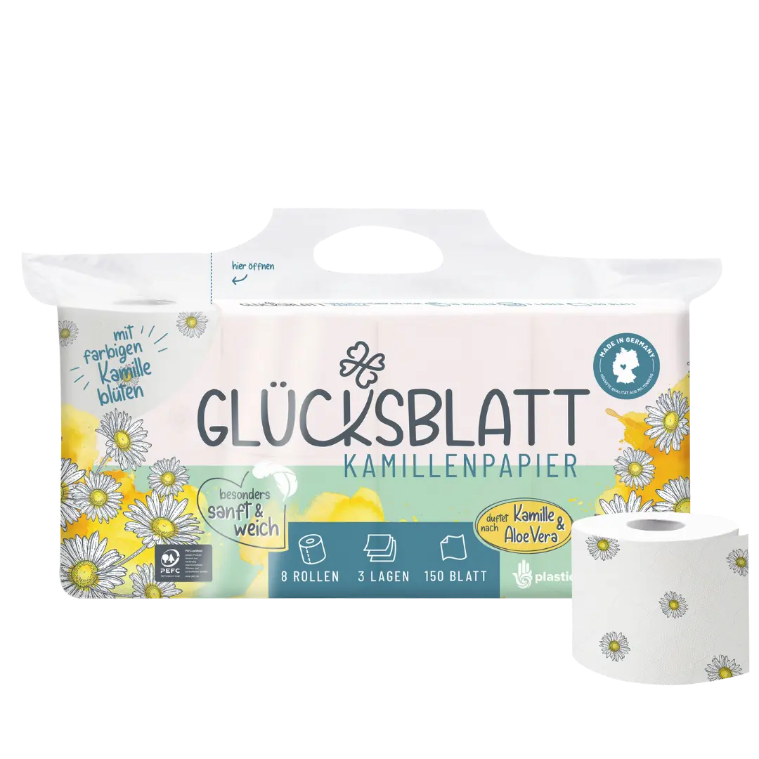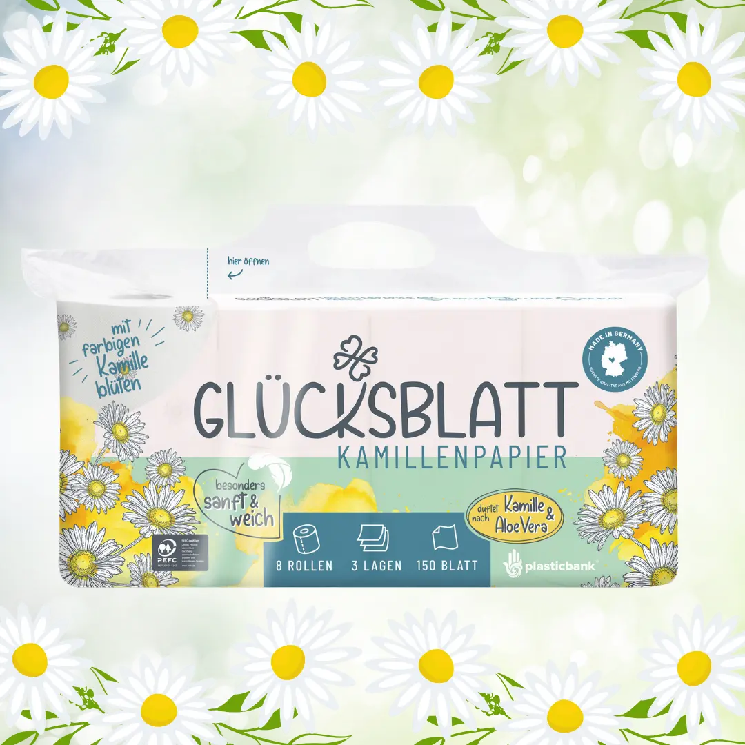 Toilettenpapier mit farbigen Kamilleblüten und Duft nach Kamille